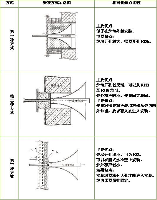 清灰效果良好,本質(zhì)安全可靠、絕不會(huì)吹損減薄換熱器管束,清灰器無需維護(hù),既能產(chǎn)生滿足清灰要求的高強(qiáng)聲能又可以不超過國(guó)家噪聲標(biāo)準(zhǔn),安裝方便、可以直接在水冷壁上開小孔安裝。