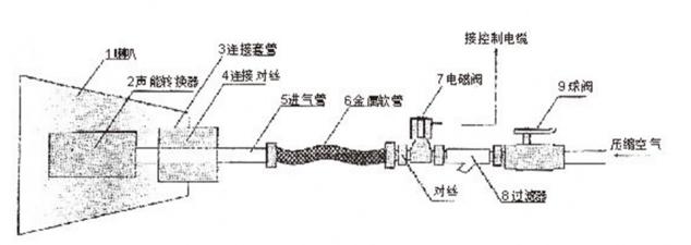 1喇叭 2聲能轉(zhuǎn)換器 3連接套管 4連接對絲 5進(jìn)氣管
